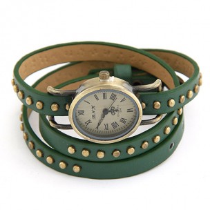 Браслет (длина 61 см, ширина 0,8 см) выполнен из кожзаменителя зелёного цвета. По всей длине изделия разместились бусины (диаметр 0,2 см), изготовленные из гипоаллергенного металла бронзового цвета. Основное достоинство такого металла - отсутствие в его составе никеля. Из такого же металла выполнены работающие часы (диаметр циферблата 2,5 см), находящиеся на браслете. Длина изделия позволяет обматывать браслет вокруг запястья до трёх раз (в зависимости от толщины запястья). Крепится украшение засчет классической застежки-пряжки.