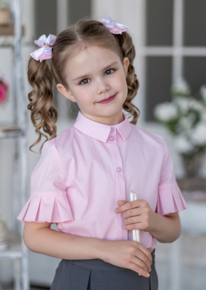 Оригинальная блузка свободного силуэта из ткани поплин нейлон для младшей возрастной группы. Блузка с центральной застёжкой на планке на петли пуговицы. Спинка с мягкой встречной складкой от горловины. Рукав втачной, длиной выше локтя, с воланом по низу. Волан рукава с встречными складками. Воротник рубашечный на притачной стойке. Производитель оставляет за собой право изменения дизайна отделки, фурнитуры и оттенка ткани без потери для внешнего вида и качества изделий.